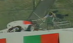 Irgendwie gibt es immer Leute die zum falschen Zeitpunkt am falschen Ort sind, aber mit verdammt viel Glück davonkommen… Hätte dieser Kameramann auf seiner Tribüne kein Dach gehabt, wäre sicher nicht mehr viel von seinem Kopf über.