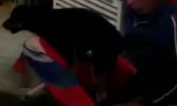 Betrunkene sind immer wieder lustig anzuschauen. Oftmals sind Betrunkene auch Opfer von bösen Scherzen oder sexuellen Übergriffen. Wenn er schon wehrlos ist, warum nicht auch gleich ein bisschen sexuell werden, hat sich dieser Hund wohl gedacht.