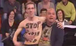 Eigentlich wollte der nur mit einem Tanga bekleidete junge Mann gegen Pelze demonstrieren. Doch irgendwie hat er nicht mit dem Moderator gerechnet, der will ihn nämlich unbedingt ohne Tanga sehen.