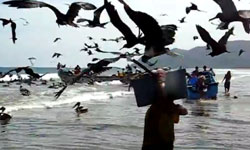 Ein Fischer versucht nur seinen Fang an Land zu bringen, das ist angesichts der verfressenen Vögel gar nicht so einfach.
