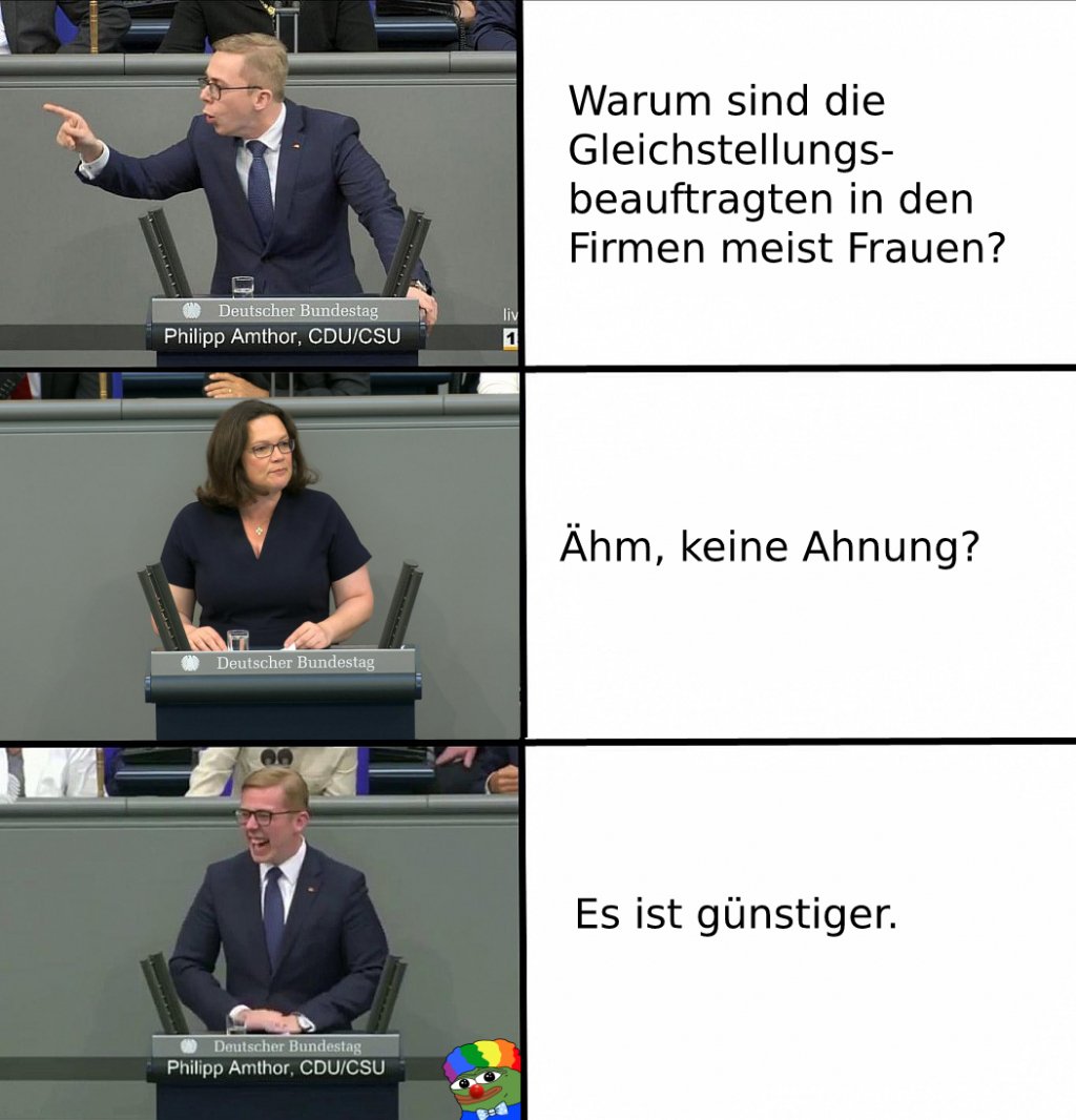 In dieser SPD, die ihr Kernklientel über Bord geworfen hat, ist es egal wer an der Spitze steht. Aber die Amthor Nahles Memes sind seit langem mal deutsche Memes bei denen ich schmunzeln musste.